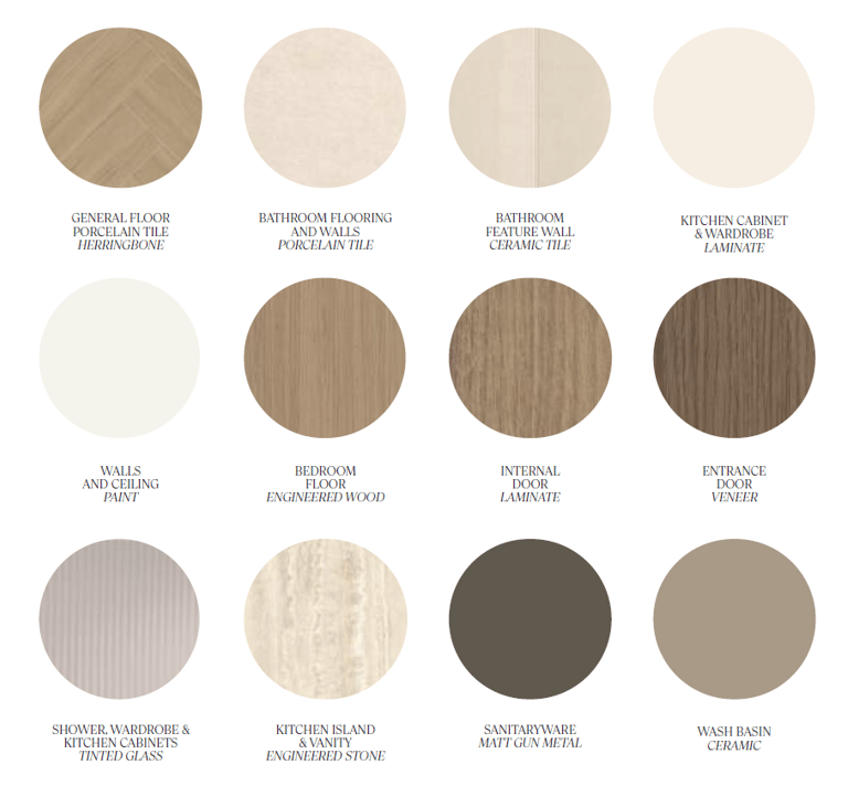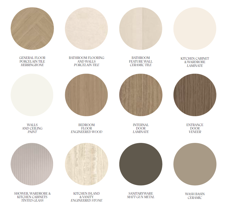 A harmonious palette of warm tones, complemented by rich, tactile finishes. Natural textures from polished timber floors to sun kissed cabinetry bring timeless elegance and understated refinement to every space.