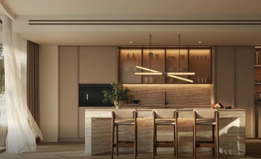 Sıcak tonlardan oluşan uyumlu bir renk paleti, zengin ve dokunsal yüzeylerle tamamlanıyor. Cilalı ahşap zeminlerden güneşle aydınlanmış dolap yüzeylerine uzanan doğal dokular, her mekâna zamansız bir zarafet ve sade bir incelik katıyor.
