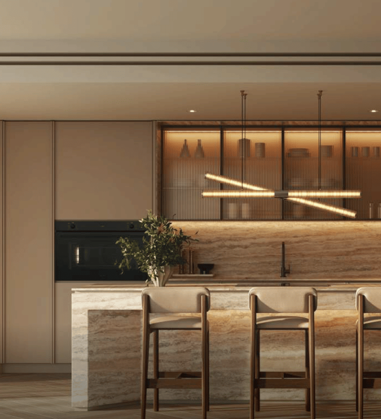 A harmonious palette of warm tones, complemented by rich, tactile finishes. Natural textures from polished timber floors to sun kissed cabinetry bring timeless elegance and understated refinement to every space.